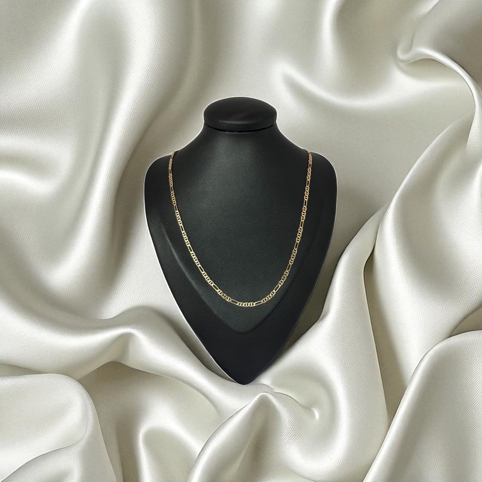 Está confeccionada con materiales de alta calidad y un acabado pulido que garantiza brillo duradero y resistencia. Su diseño de eslabones tipo 3 x 1 (tres pequeños y uno alargado) ofrece una textura armónica y una caída cómoda, perfecta para usar sola o acompañada de un dije. Una joya que combina fuerza, estilo y distinción en cada detalle.