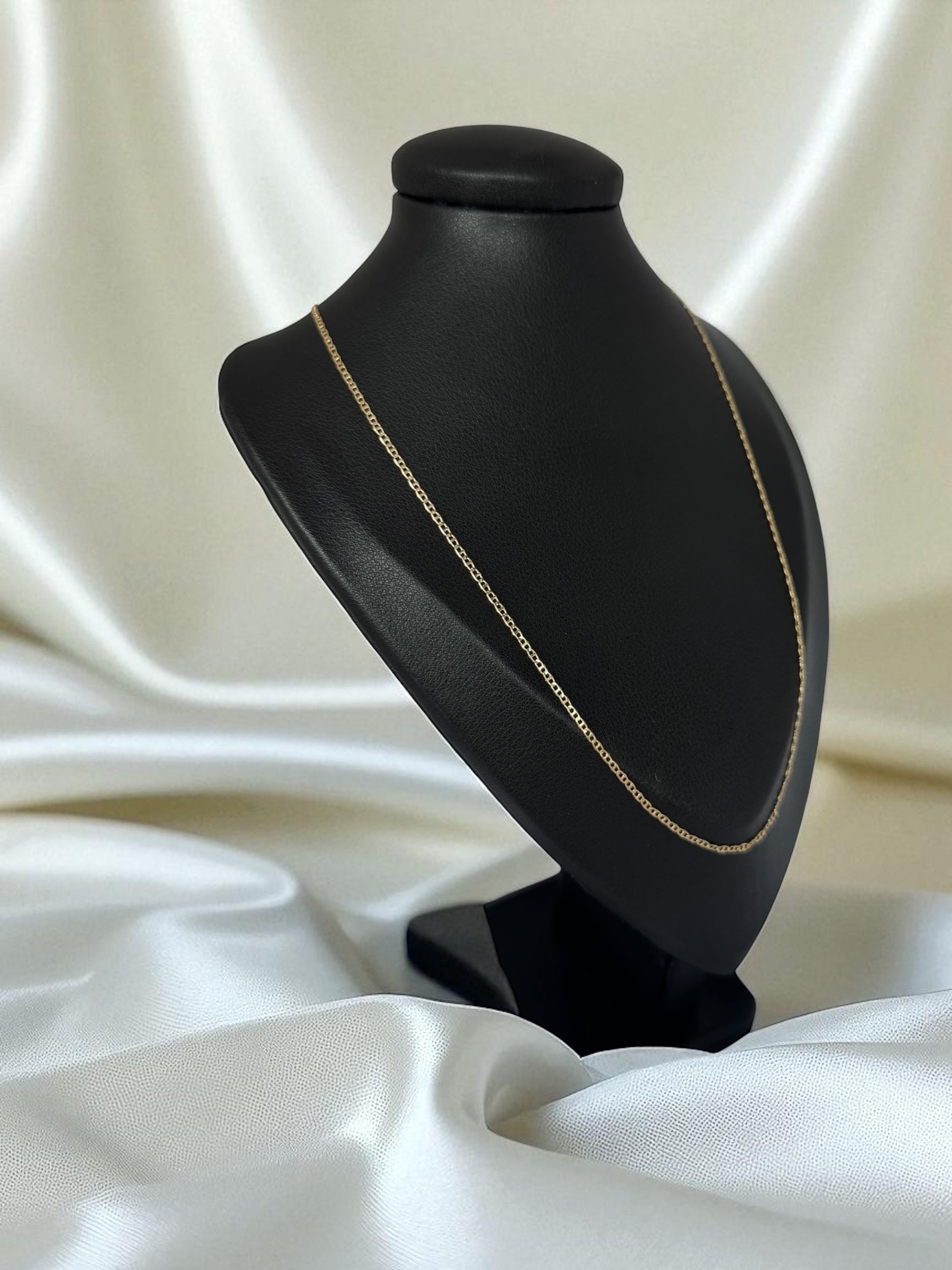 Mide 55 cm de largo, lo que permite que se adapte cómodamente al cuello, resaltando su forma con una presencia sutil y femenina.