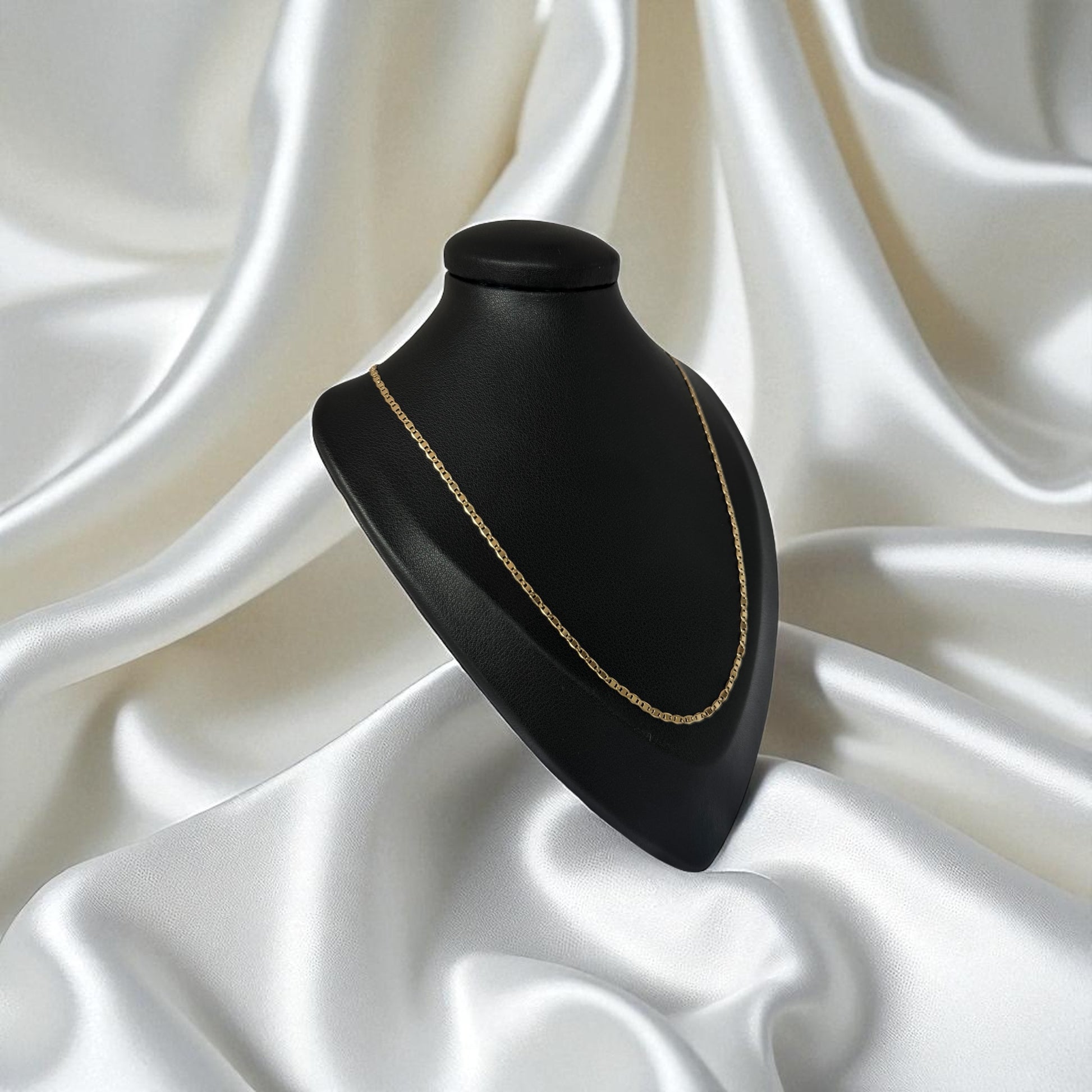 Está confeccionada con materiales de alta calidad y un acabado pulido que ofrece brillo intenso y durabilidad. Su diseño de eslabones tipo escalera con efecto espejo proporciona una textura elegante y una caída uniforme, destacando por su luz y movimiento. Perfecta para usar sola o acompañada de un dije, aportando distinción y estilo atemporal.
