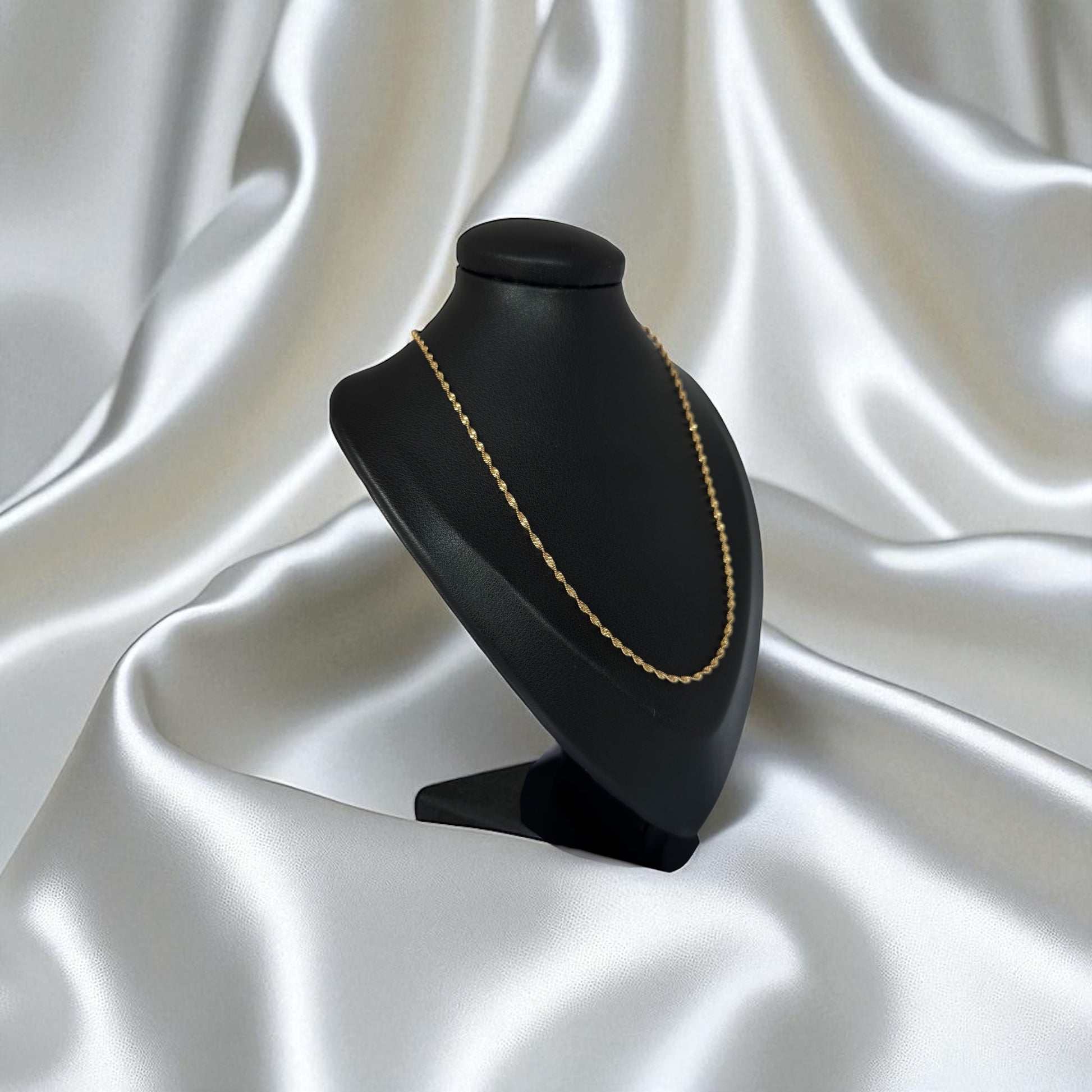 Está elaborada con materiales de excelente calidad y un acabado pulido que garantiza resistencia y brillo duradero. Su trenzado en forma de espiral proporciona una textura delicada, flexible y cómoda al usar, ideal para lucir sola o acompañada de un dije. Una pieza versátil que combina modernidad y distinción en cada detalle.