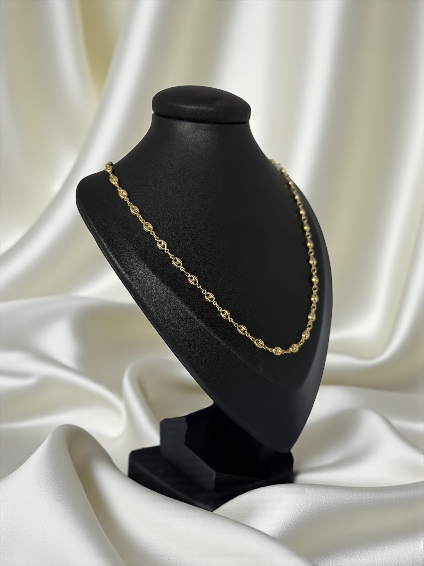 Está confeccionada con materiales de excelente calidad y un acabado pulido que garantiza durabilidad y luminosidad. Su característico diseño de eslabones ovalados ofrece una textura elegante y una caída fluida, brindando comodidad y versatilidad. Perfecta para usar sola o acompañada de un dije, es una joya que combina resistencia, estilo y elegancia.
